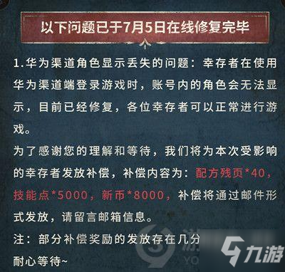 华为渠道角色显示丢失的问题处理进度,目前该问题已经修复,幸存者们可以正常进行游戏。