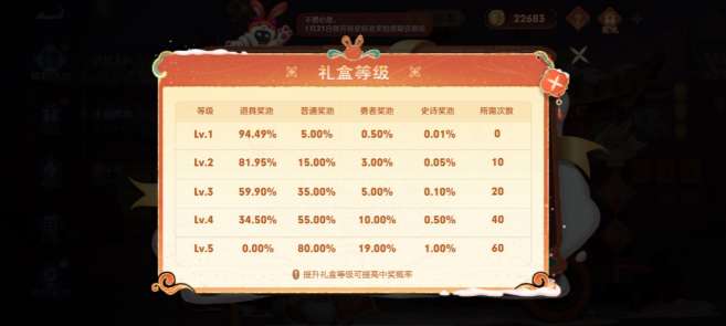 2、礼盒奖励:礼盒奖励分皮肤卡和道具卡,玩家可以消耗小兔币进行奖励刷新,刷新次数越多,获取高级奖励的概率越高。