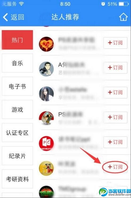 在热门达人分类列表上面,找一些带有电影视频的分享的达人,点开他们的名字看里面有没有分享的电影视频,然后“订阅”关注他们的个人动态。