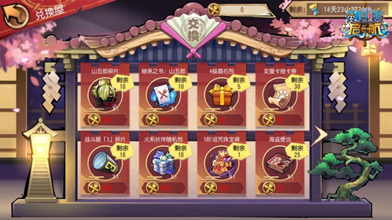 兑换屋活动期间开放两期,分别为4月30日~5月3日、5月7日~5月10日,玩家可通过获得的山五郎纪念币在兑换屋内兑换山五郎碎片、山五郎专属碎片、继承之书:山五郎等超值豪物!限定礼包活动时间为4月30日0:00~5月16日23:59,活动期间可购买超高性价比的和之国限定礼包,购买后可获得钻石*6480、山五郎角色碎片*30、山五郎专属碎片*30、继承之书:山五郎*20、山五郎纪念币福袋*18、和之国祭祀礼盒*18。特惠礼包,仅可购买一次,机不可失,船长们记得把握机会!