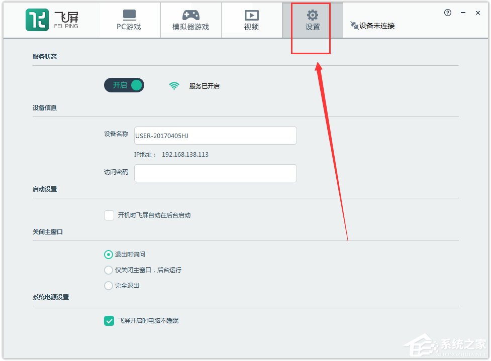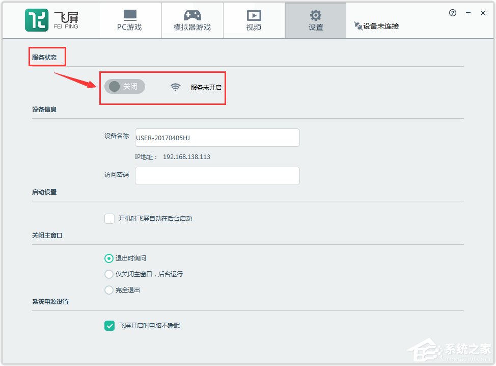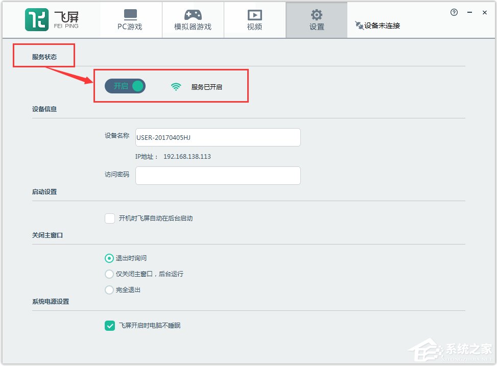 这里是飞屏功能的控制开关,通过此处可以开启或关闭飞屏功能。当开启飞屏后,其他同一网络下的设备可以发现并连接此电脑。当关闭飞屏后,其他设备无法发现该电脑。