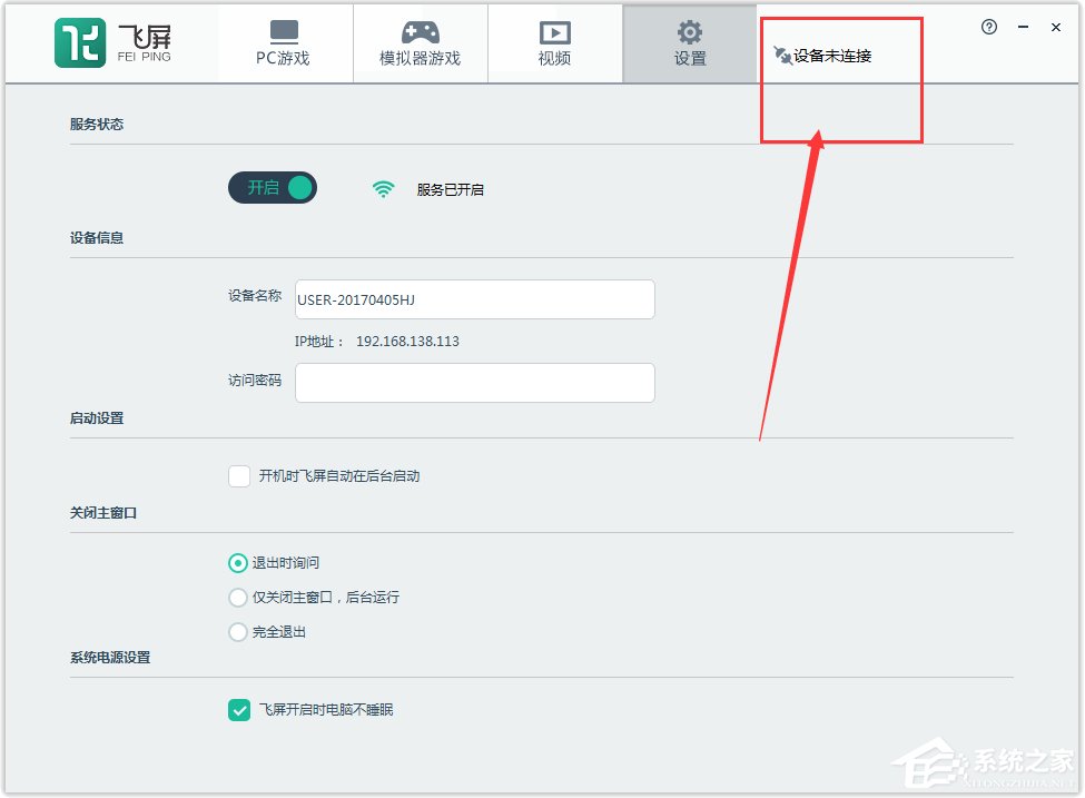 在飞屏的使用过程中,电脑必须处于开机、不睡眠的状态。否则将出现搜索不到电脑或飞屏中断的情况。